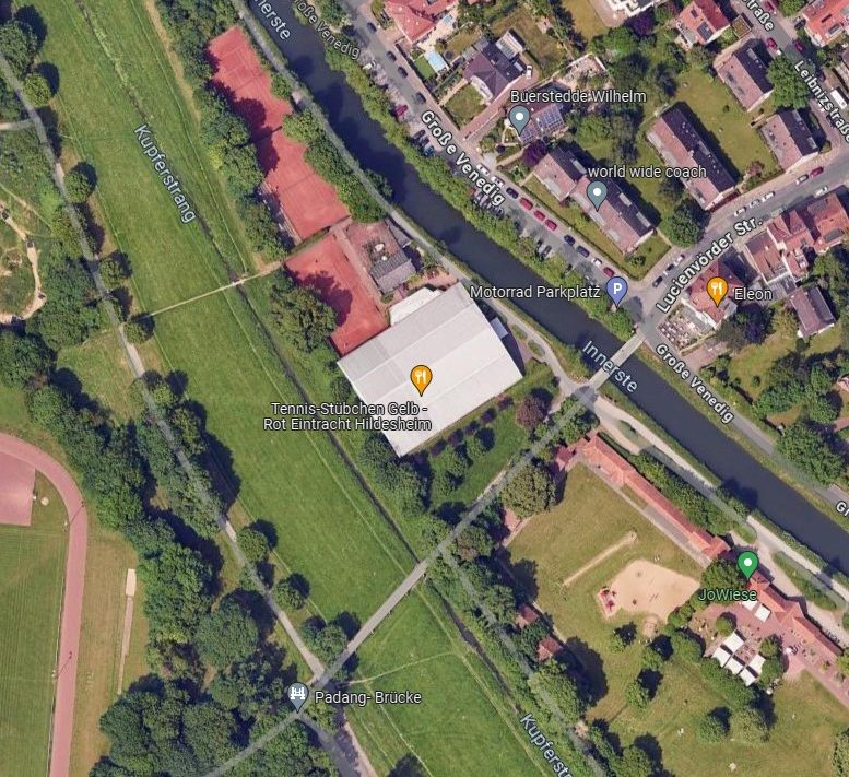 Zur Anfahrt in das Navi “Große Venedig” oder einfach “Tennisstübchen” eingeben. Kostenlose Parkplätze befinden in der Straße “Große Venedig” gegenüber auf der anderen Seite der Innersten.